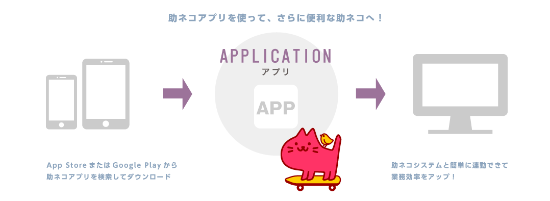 お手持ちのスマートフォンやタブレット端末に「助ネコアプリ」をダウンロードするだけで、